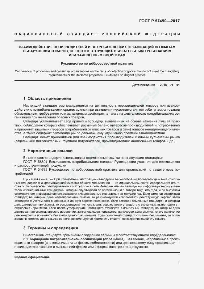 ГОСТ Р 57490-2017 Взаимодействие производителей и потребительских организаций по фактам обнаружения товаров, не соответствующих обязательным требованиям или заявленным свойствам. Руководство по добросовестной практике
