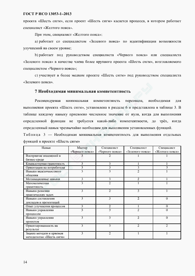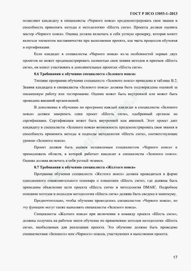 Область и условия применения: В настоящем стандарте установлена методология улучшения деятельности организации «Шесть сигм». Методология обычно включает пять этапов: определение, измерение, анализ, улучшение (совершенствование) и контроль (DMAIC).