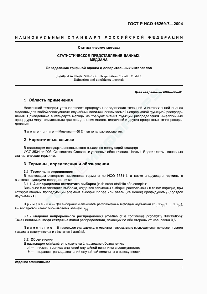 Область и условия применения: Настоящий стандарт устанавливает процедуры определения точечной и интервальной оценок медианы для любой совокупности случайных величин, описываемой непрерывной функцией распределения. Приведенные в стандарте методы не требуют знания функции распределения. Аналогичные процедуры могут применяться для определения оценок квартилей и других процентных точек распределения